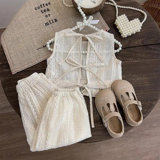 סאלי - חליפה תחרה לבן , מכנס ארוך וטופ גופייה עם פריזים בקצוות