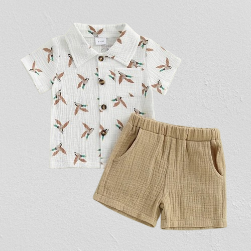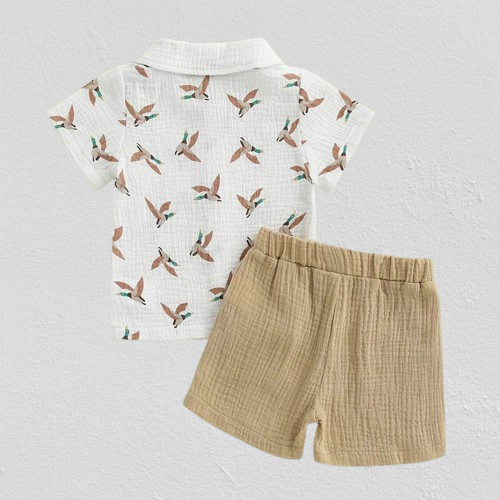 חליפת פשתן לפעוטות - מכופתרת קצרה עם הדפסי ברווז + מכנסים קצרים